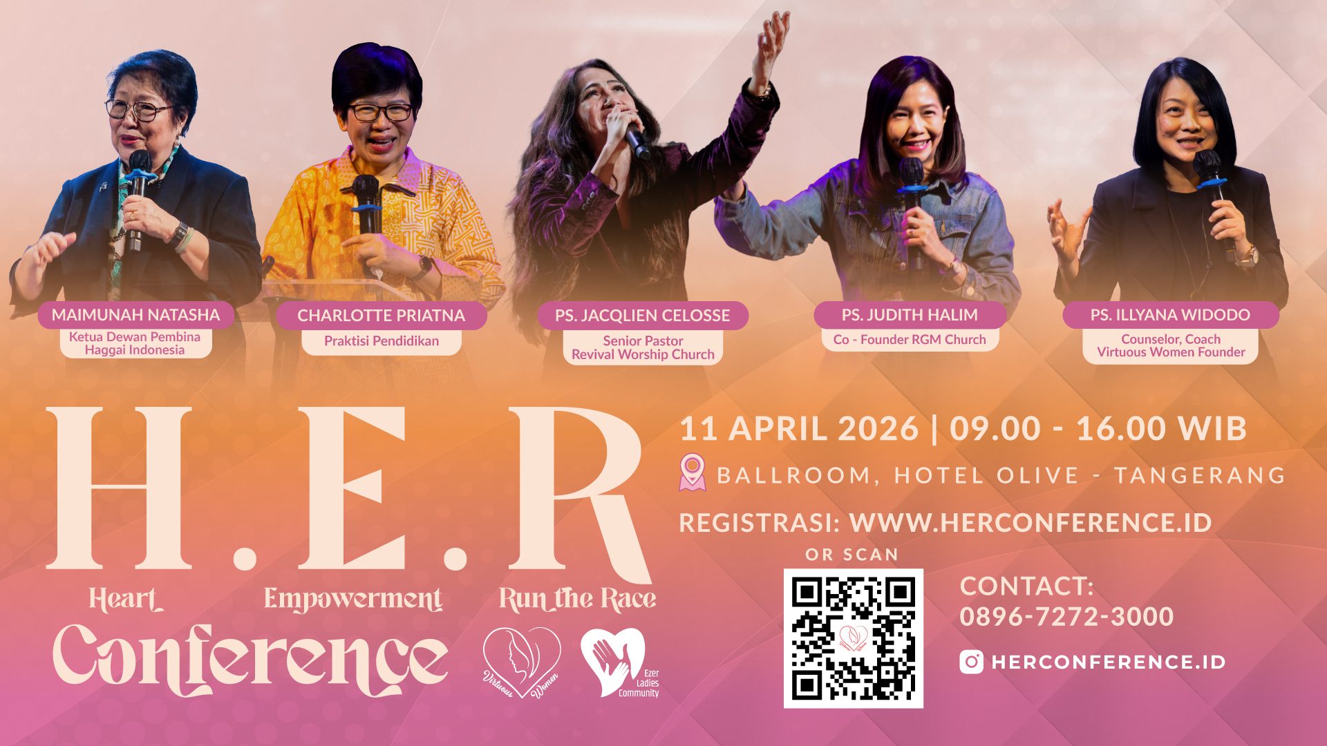 HER Conference diadakan untuk menjadi ruang bagi wanita untuk dipulihkan, diperlengkapi, dan diimpartasi, sehingga setiap wanita dapat bangkit dan menjalankan peran yang Tuhan percayakan di tempat ia ditempatkan.